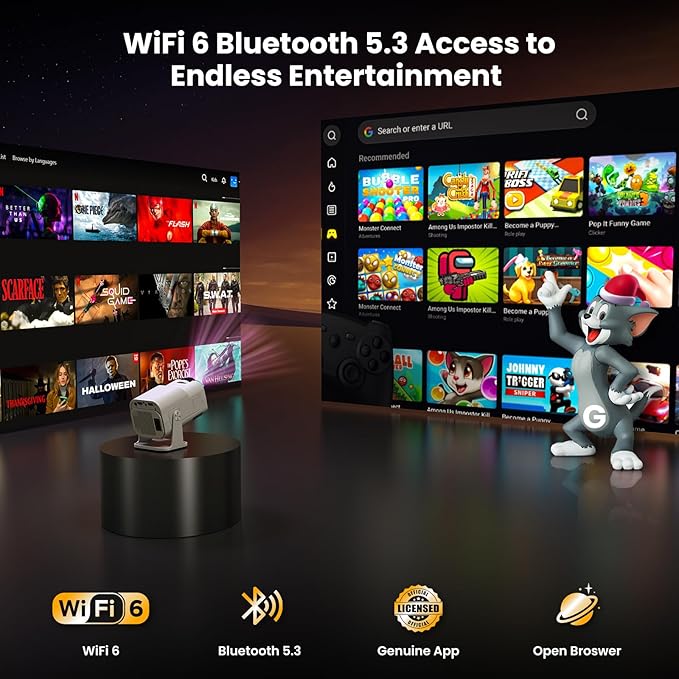 - [NetfIix-Officially Licensed, Not Need Extra Devices]: GM600 NTV Projector is NetfIix-Officially Licensed. GM600 NTV Home/Outdoor Projector Out of the Box. One-click access to NetfIix, Prime Video, YouTube, D+ and over 20,000,000+ videos. Built-in Open Browser, My App, and App Store meet your personalized entertainment needs. GM600 NTV 4K Projector will perform regular updates for the Apps to ensure the security and stability