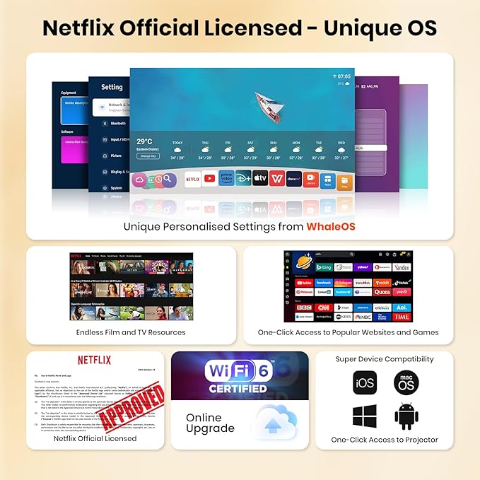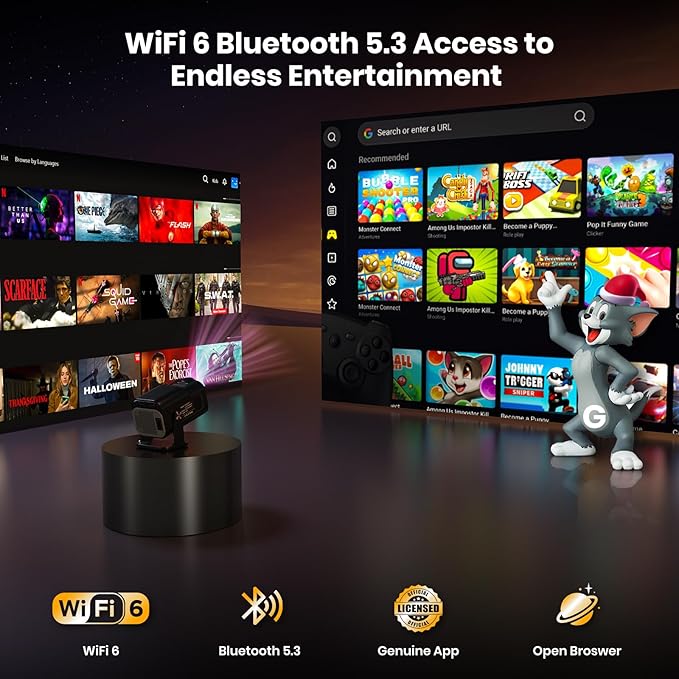 - [NetfIix-Officially Licensed, Not Need Extra Devices]: GM600 NTV Projector is NetfIix-Officially Licensed. GM600 NTV Home/Outdoor Projector Out of the Box. One-click access to NetfIix, Prime Video, YouTube, D+ and over 20,000,000+ videos. Built-in Open Browser, My App, and App Store meet your personalized entertainment needs. GM600 NTV 4K Projector will perform regular updates for the Apps to ensure the security and stability