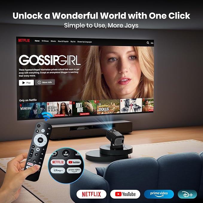 [NetfIix Official/Stereo Speakers] 4K Projector with Wifi and Bluetooth, 1080P Native Mini Projector Portable, One-Click Use Built-in NetfIix/YouTube/PrimeVideo/D+, Smart Home Outdoor Projector