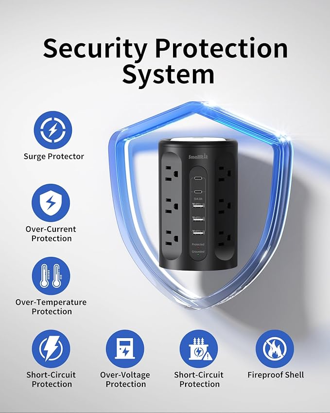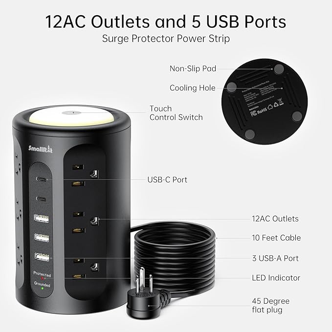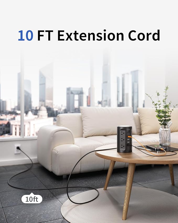 - Space-Saving Vertical Design: Maximize desk space and keep your workspace organized with the vertical tower design that minimizes surface area use while maximizing outlet availability. Perfect for small desks, tight spaces, and cluttered areas, this power strip eliminates messy wires and provides a clean, tidy setup for all your electronics, from laptops to speakers