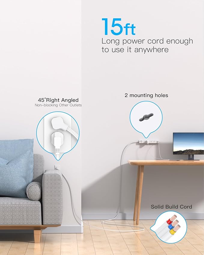 - 【Long Surge Protector Power Strip 15FT】The electric strip has a 1080-Joule energy rating providing a reliable power extension cord to protect your devices and appliances: TV, printers, computer. It secures your electronic devices from overload, short circuit, power spikes, lightning strikes, or fluctuations. (The "SURGE PROTECTED" soft indicator light on to show your devices are protected).