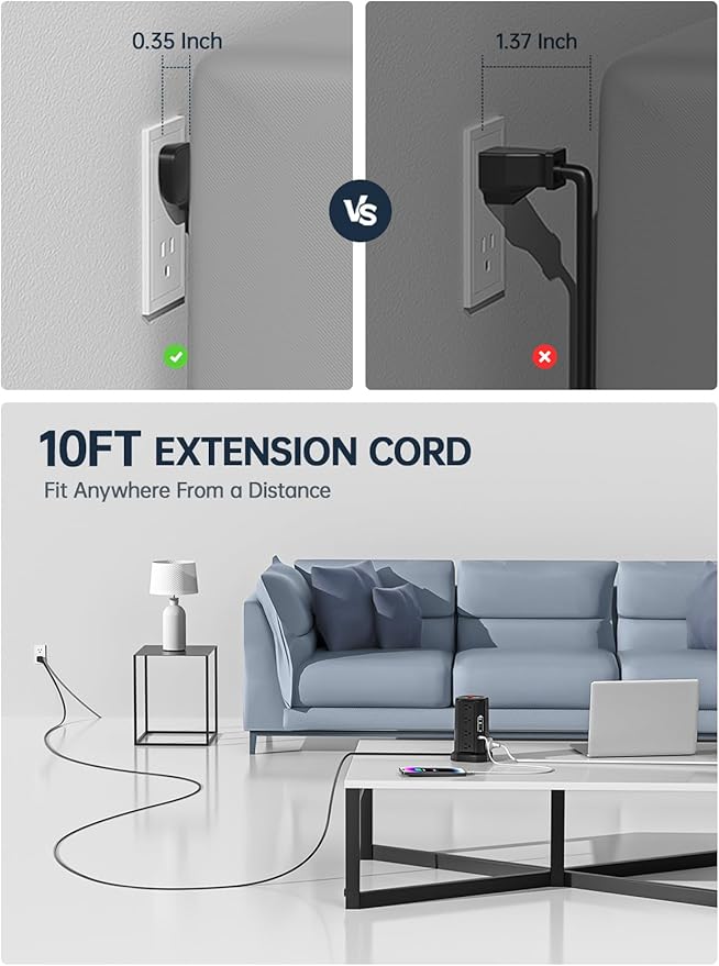 - 【Flat Plug Power Strip】The flat plug design on this usb power strip allows the plug to fit into tight spaces like hard-to-reach outlets hidden behind furniture easily, it also has a right angle so that it won’t block another outlet in a duplex.