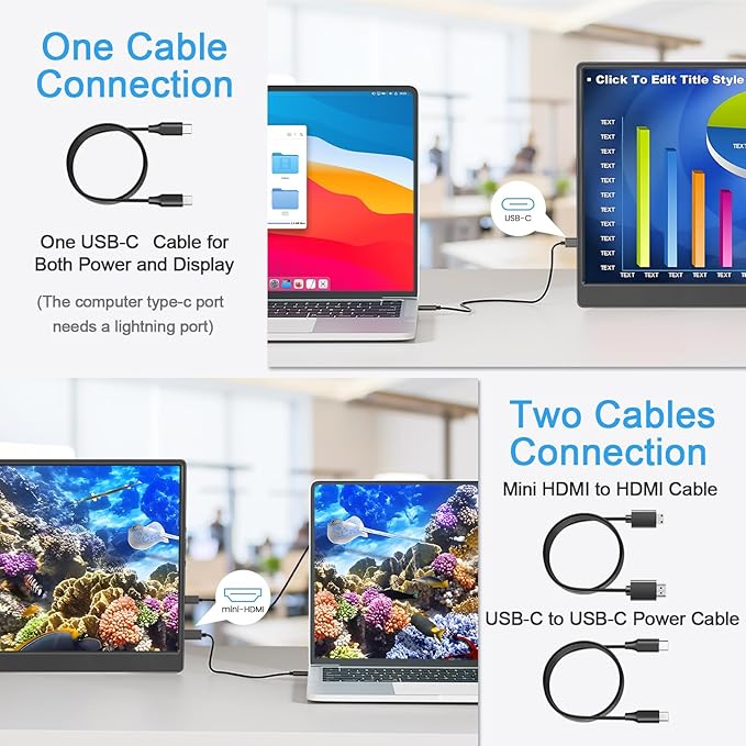 - 【Wide Compatibility】UFYQL Portable Computer Monitor features two full-featured USB Type-C ports and one Mini-HDMI port, which makes it easy to provide display signals and power to the monitor using a single USB Type-C cable, as long as your device supports Thunderbolt 3 or 3.1 USB Type-C. It's compatible with a wide range of devices, including laptops, PCs, MacBooks, PS5/PS4, Xbox, Switch, Steam Deck, and more