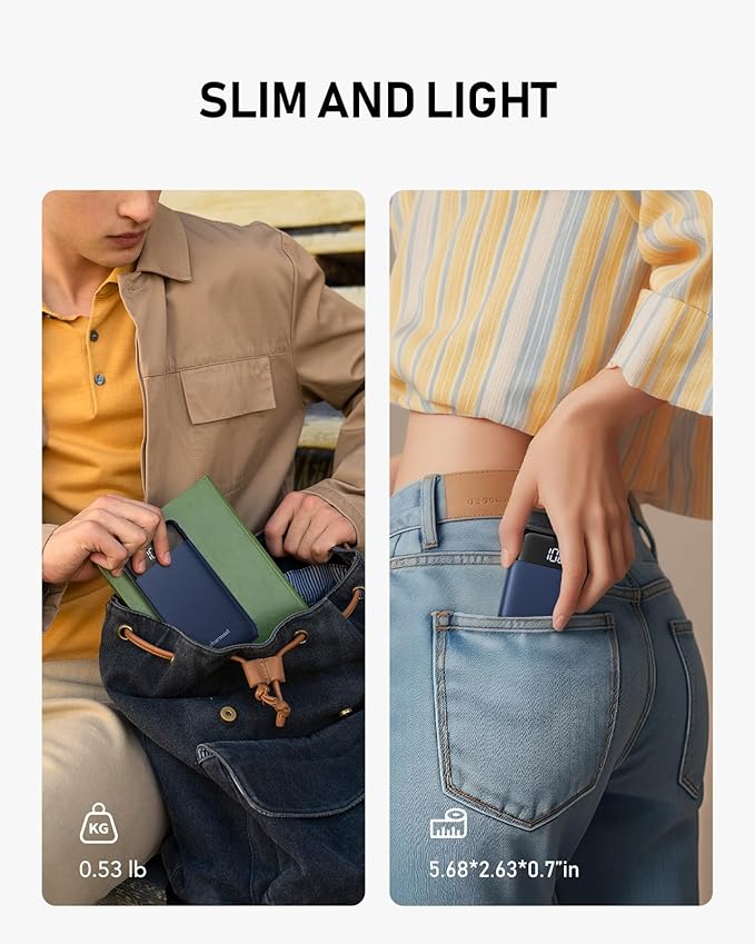 - 【Pocket-Sized & Lightweight】Lighter and slimmer than most smartphones, this portable charger fits effortlessly in your jeans pocket, butt pocket or jacket. It's no bother to carry—toss it in your briefcase, crossbody bag, or any kind of pack without a second thought. Perfect for on-the-go use, it slips easily into any space without adding bulk. The ideal companion for daily commuting, concerts, and life on the move