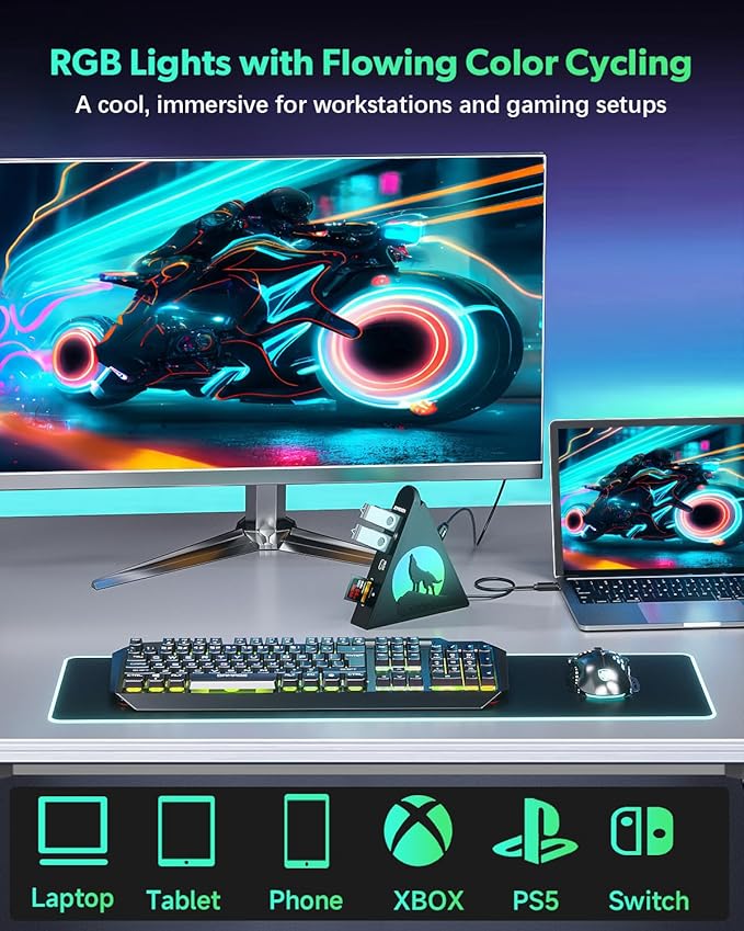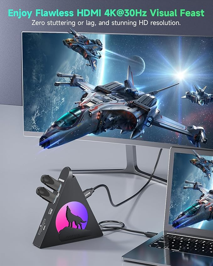 - 8-in-1 USB-C Multi Port Hub – Are you tired of your laptop having too few ports or struggling with unreliable connections? Our RGB USB-C hub solves that problem! It features a USB-C 100W PD-in 85W output, a 4K@30Hz HDMI, a USB-C 3.0 and three USB-A data ports, microSD/SD card slots. The multi-port adapter USB-C hub combines functionality with a striking howling wolf design and subtle RGB elements. It supports high-speed data transfer and fast charging for laptop, making it perfect for work, daily use, or gaming.