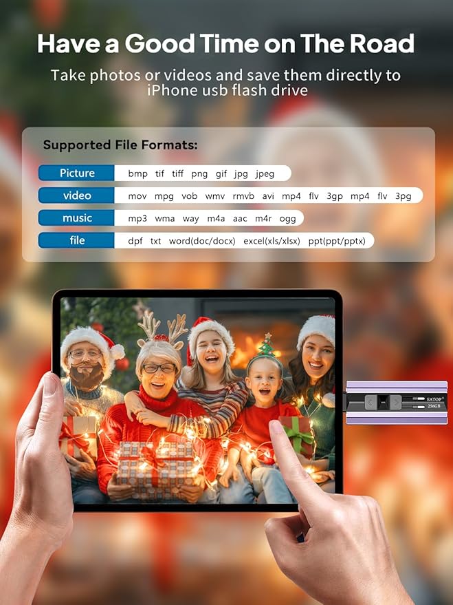 - 【Plug and Play, No Application Required, Instantly Increases Phone and Tablet Memory Space】If you almost used up all space on your Phone or Tablet, this photo stick for Phone helps to expand your memory at full storage with 256GB. The usb memory stick for photos is also a great partner for traveling photographers editing on Tablet. Using this memory device for your Phone, Tablet or Computers, no worries with the Phone storage anymore!