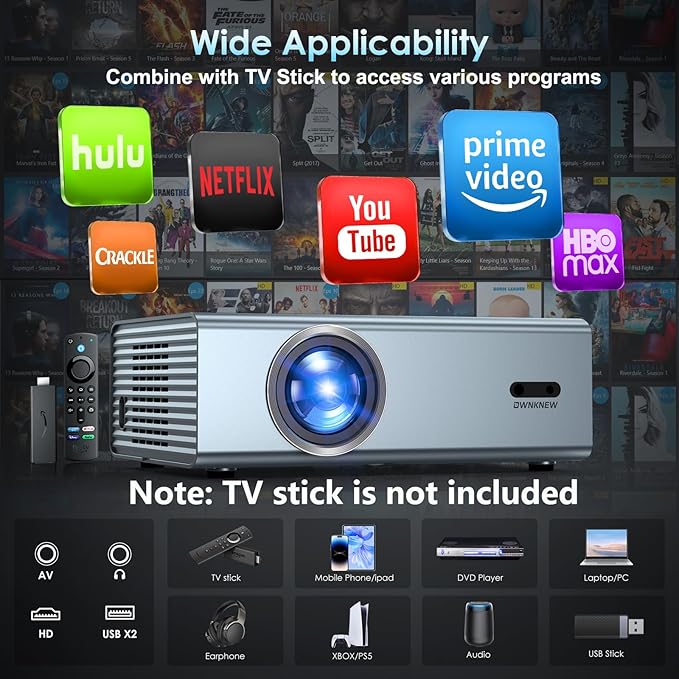 - 【Plug-and-Play & Budget-Friendly】This mini projector skip the expensive built-in systems—simply plug in your own TV dongle and start streaming your favorite movies, shows, and live TV in seconds! This design reduces additional system costs, allowing us to focus on core features while keeping the price affordable. Perfect for renters, bedroom home theaters, small meeting rooms, and more—portable, easy to set up, and ready to enjoy anytime. Note: TV dongle is not included and must be purchased separately.