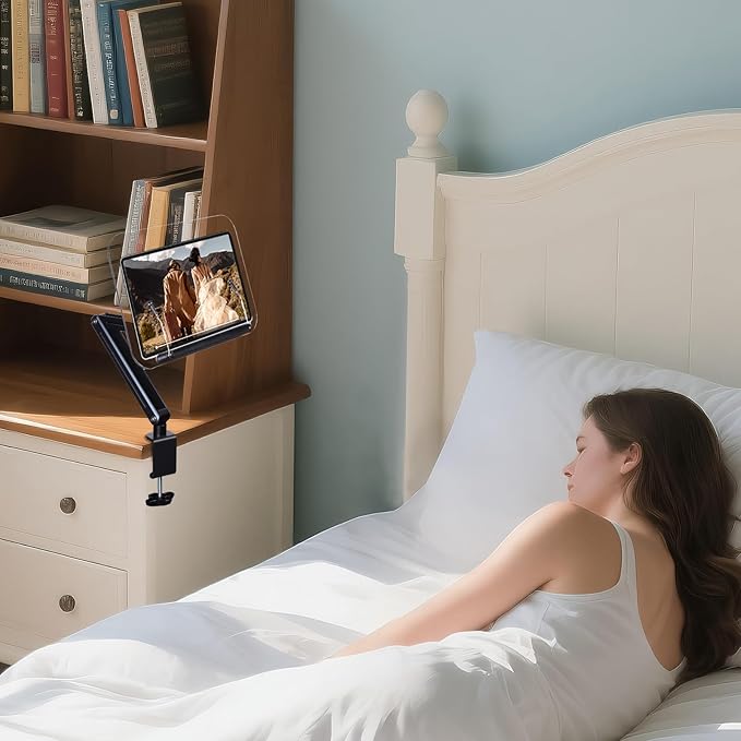 ASIEIT Book Stand with Clamp, Acrylic Desk Clamp Book Holder, 360° Cookbook Stand for Kitchen, Recipe Book Stand, Height and Angle Adjustable, Foldable and Portable for Office, Bible,Magazine,Laptops