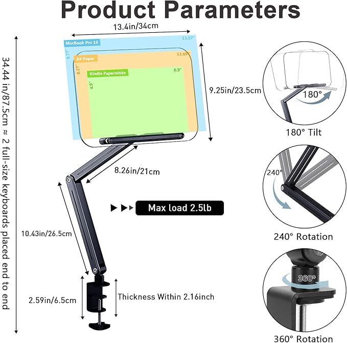 - Portable & Lightweight: With dimensions of 13.4 x 9.25 x 1.77 inches and a weight of just 2.23 lbs, this portable book stand with clamp is both portable and easy to store in a drawer or on a shelf. Note: Please use the included hex wrench to increase the tension on both connectors