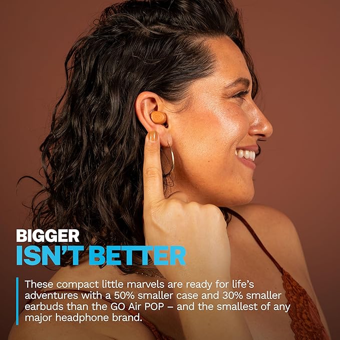 - ๐ค BIGGER ISNโT BETTER / PLENTY OF PLAYTIME: These compact little marvels are ready for lifeโs adventures with a 50% smaller case and 30% smaller earbuds than the GO Air POP โ and the smallest of any major headphone brand. Enjoy 5.5 hours of playtime in each earbud or 20 total hours with the charging case for an all-day listening experience where size doesn't compromise performance.
