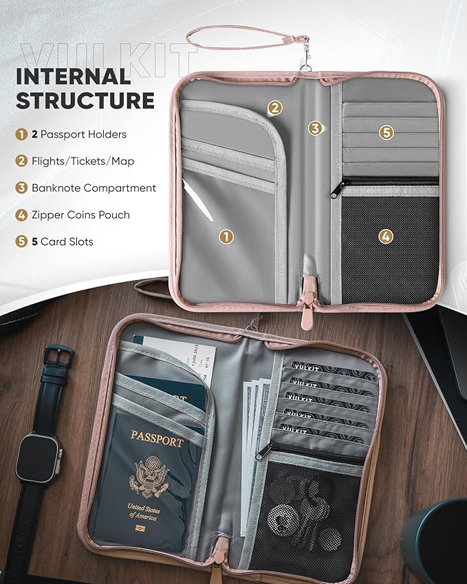 - FLEXIBLE INTERNAL STRUCTURE- Enjoy quick and easy access to all your essentials with travel wallet. Five credit card slots for credit cards, two passport sapce, an zipper mesh bag for coin, SIM cards, an banknote position, a ticket slot, a front mesh slot for documents or pens.