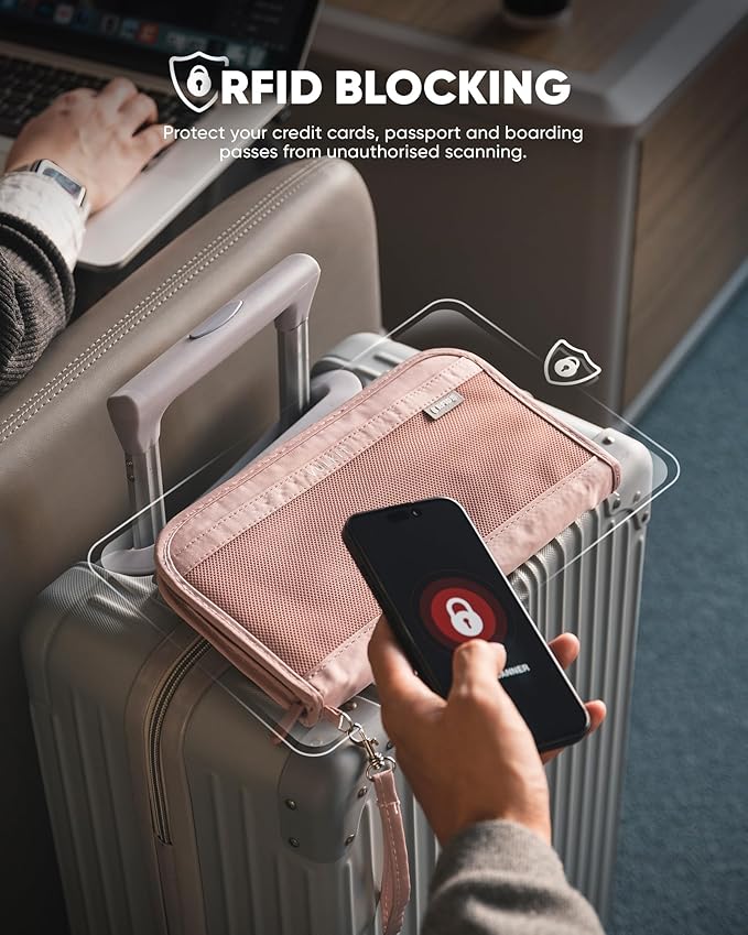 VULKIT Passport Wallet Passport Family Holder RFID Blocking Travel Card Organizer with Wrist Strap for Men or Women(Pink)