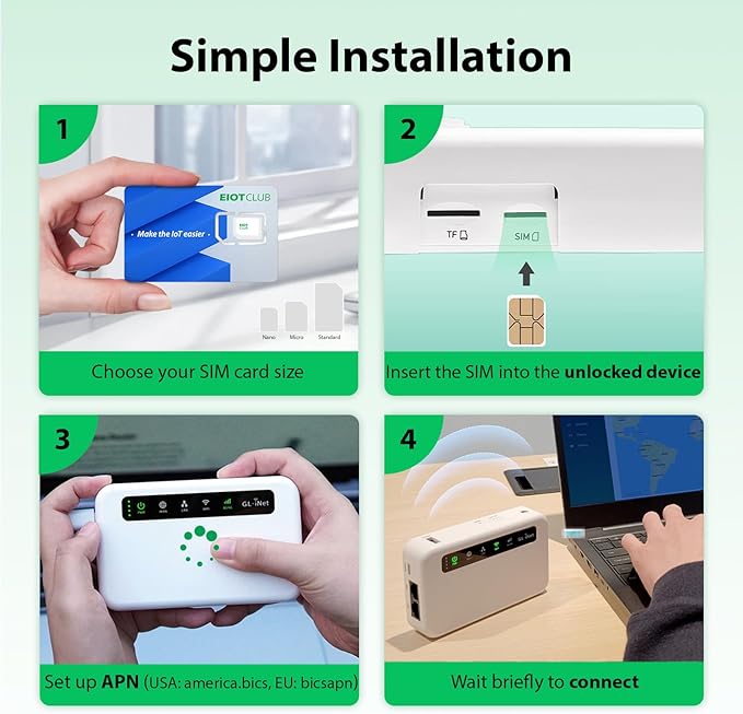 - Device Compatibility - Pre-cut SIM cards are compatible with iPhone, Android phone, tablet, 5G/4G router, WiFi hotspot, 4G modem, and more unlocked decives. USA APN: "america.bics", EU APN:"bicsapn"