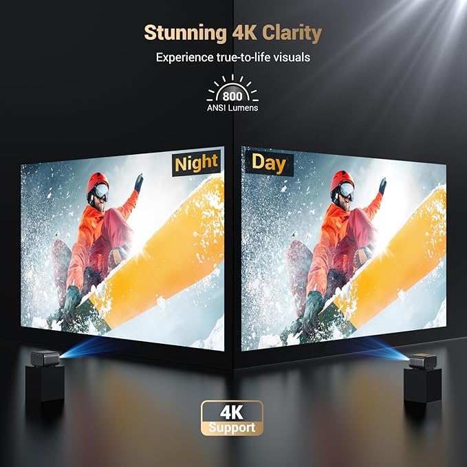 - Unleash Stunning Visuals: This movie projector has true 1080P HD (2.07 million pixels) and 4K decoding support (requires 4K content). Games look sharp with crisp details, movies feel like theater-grade quality, and shows burst with vivid colors – every scene looks lifelike, free from blurry edges, with vibrant hues and clear contrasts between dark and bright areas. Perfect for your living room wall or home theater setup.