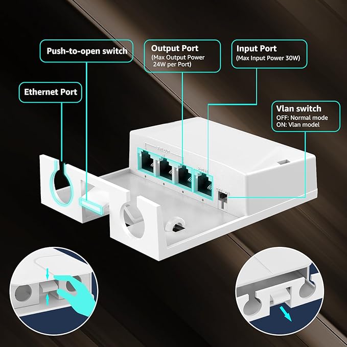 - 【VLAN and Extend 250m】A single POE out port can handle 10Mbps speed and 250m transmission range when the extend mode is enabled. Out Ports 1 - 3 support VLAN isolation, preventing data leakage, and increase network security.