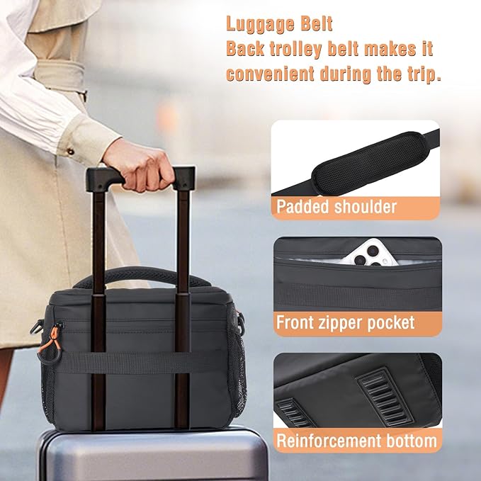 - Made with waterproof polyester material. Waterproof rain cover included can fully protect the whole camera bag from rainwater, keep your belongs not be wet. Back trolley belt makes it convenient during the trip. Lightweight and portable, this camera bag offers quick access to your gear and versatility for your photography adventures.