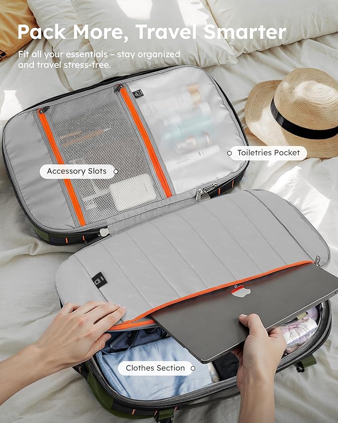 - 【Expandable 35L to 45L Versatility】Pack just right every time. Expand from 35L to 45L to suit your schedule - commutes, gym sessions, or 3-5 day getaways. With dual main compartments, waterproof aluminum-lined wet/dry dividers, and smart internal organization, this expandable versatile travel backpack keeps everything in place without feeling bulky.