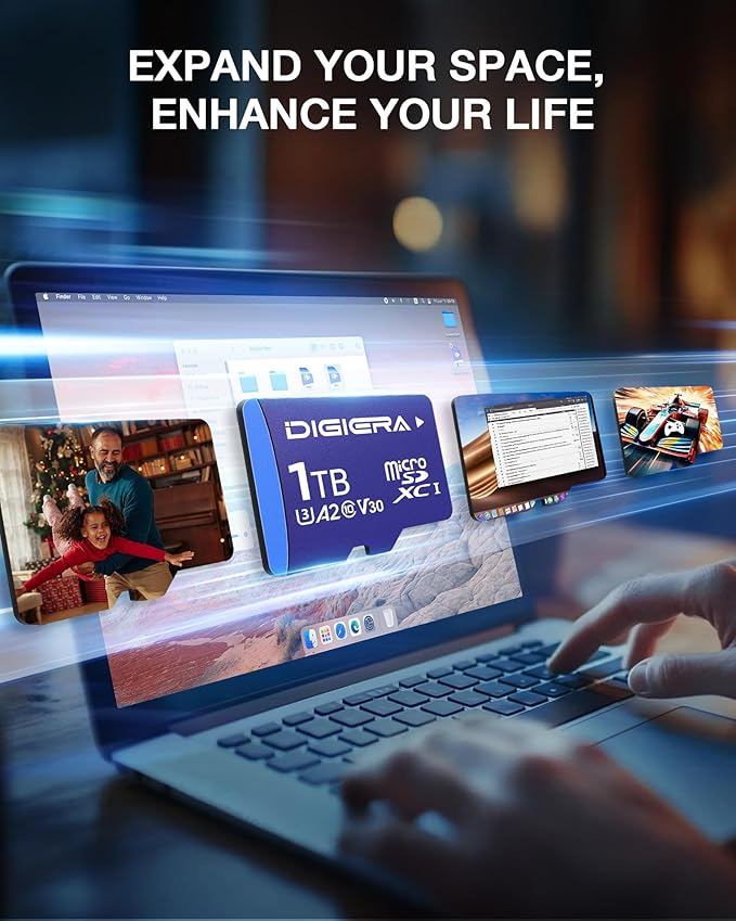 - 1T Ultimate Storage: With 1T of storage space, the DIGIERA memory card holds approximately 192,000 high-resolution photos, 45+ hours of 4K UHD video, or an enormous collection of games. Due to different capacity algorithms and partial capacity used for system files, management, and performance optimization, the available capacity may be less than the identified capacity
