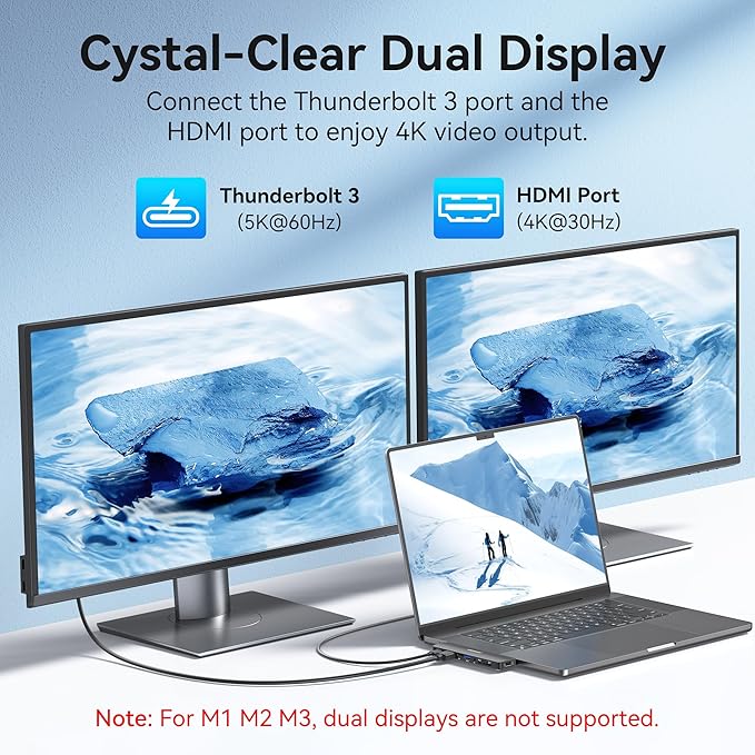 - Enhanced Connectivity with 4K HDMI and 5K Thunderbolt 3 MacBook Hub: Elevate your MacBook experience with our versatile USB C Hub. Enjoy stunning 4K resolution at 30Hz through the HDMI port and immersive 5K visuals at 60Hz via the Thunderbolt 3 port. Achieve Dual Monitor Display effortlessly—mirror or extend your laptop screen to TVs, monitors, or projectors. Note: MacBook models with M1, M2, or M3 chips do not support dual external monitors simultaneously