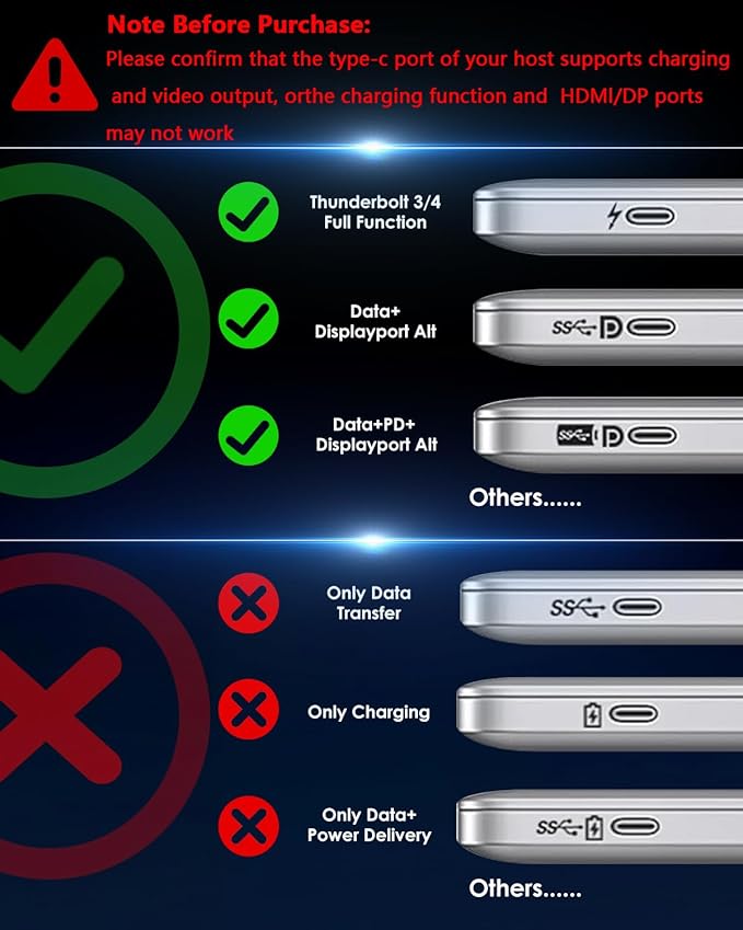 - 【Note Before Purchase】Simply Plug & Play, no external drivers required. MacOS-based computers do not support MST, only extend to one different screen (ABBB). Some Windows laptops may only support 3 monitors(including the host screen) due to their graphic card limitations. Your USB-C phones/tablets should support the OTG function. The type-C port of your host should support video output to enjoy the full function of this docking station. It is only compatible with MacBook models from 2018 and later