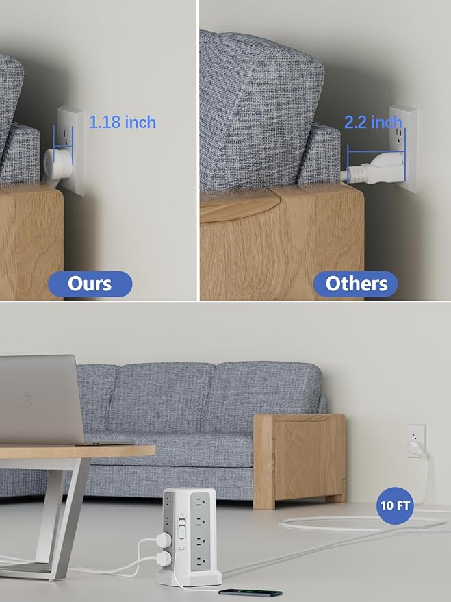 - Surge Protector Extension Cord Tower: Equipped with overload and short-circuit protection, over-current protection and etc; When the usb power outlet power is overloaded, plug strip on/off switch will automatically trip, effectively avoiding short circuits, Keep your device safe and reliable charging.