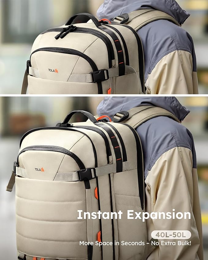 - ✅【 Smart Expandable Design & Easy Access】The personal item backpack is perfect for trips up to 5 days with dual-compartment main storage, keeping your gear organized. Expand the 40L travel backpack to 50L for extra souvenirs or compress with straps to save space. The top opening offers quick access to jackets, snacks, or travel documents—perfect for life on the go!
