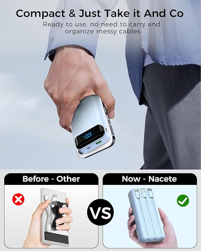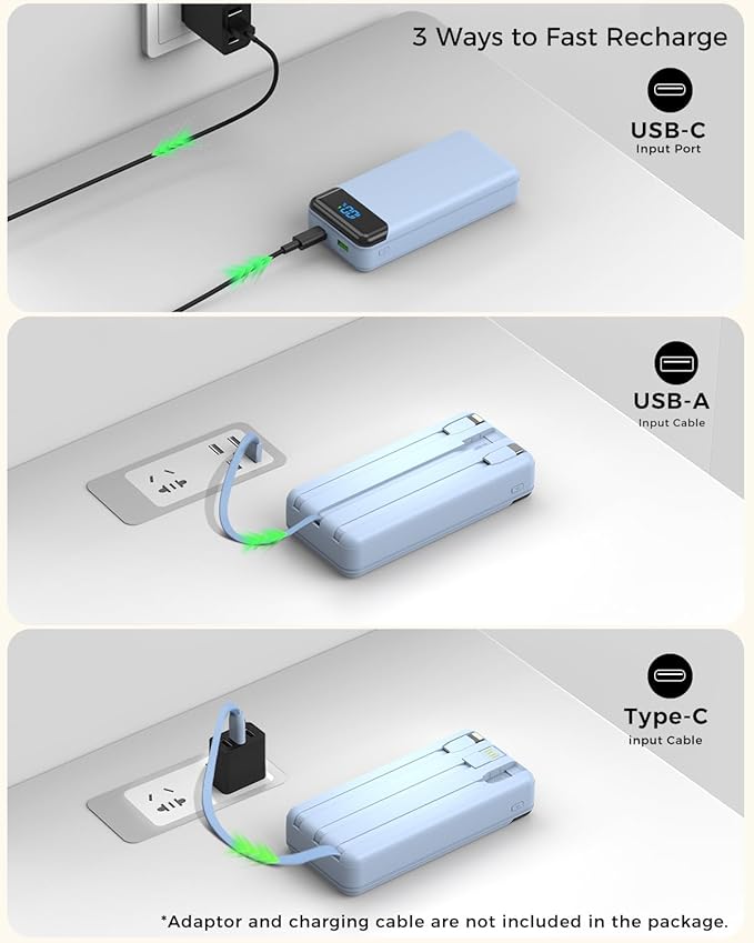 - Special Feature : Built In 3 Cables (USB-C, iOS, USB-A), Digital Display, Portable Travel Charger, Support PD 22.5W Fast Charging&20W Recharging, 40000mAh Huge Power to Go, 4 Output 3 Input, Auto Shut-Off, Over Charging Protection, LED Indicator Light Built In 3 Cables (USB-C, iOS, USB-A), Digital Display, Portable Travel Charger, Support PD 22.5W Fast Charging&20W Recharging, 40000mAh Huge Power to Go, 4 Output 3 Input, Auto Shut-Off, Over Charging Pro… See more