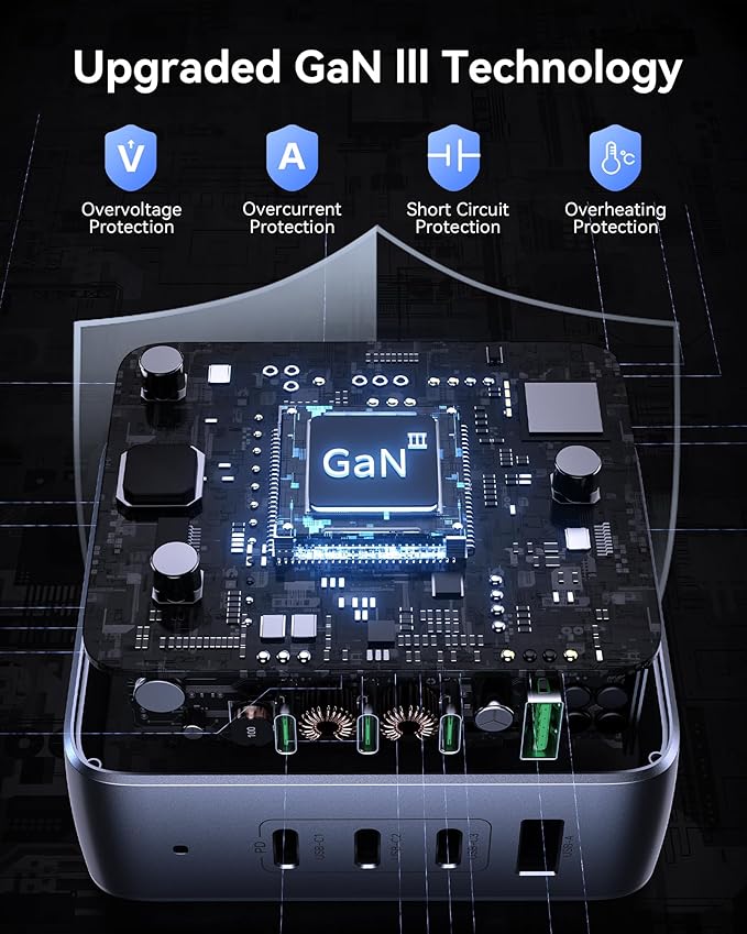 - 【Upgraded GaN III Technology】:GaN III technology enhances charger performance, achieving superior power density and efficiency compared to traditional silicon-based models. Yields compact, lightweight designs with minimized energy loss, optimized energy utilization, and decreased heat generation