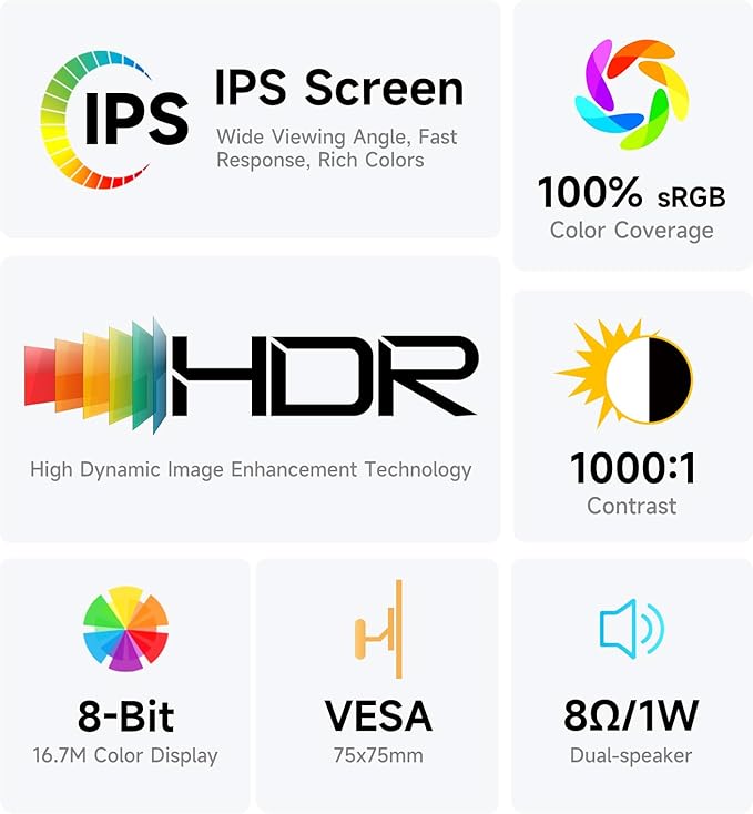 - [100% sRGB Color Gamut] Our 18.5 inch portable monitor used IPS screen, reduces blue light radiation damage, HDR higher screen quality for higher motion clarity and smoother game visuals