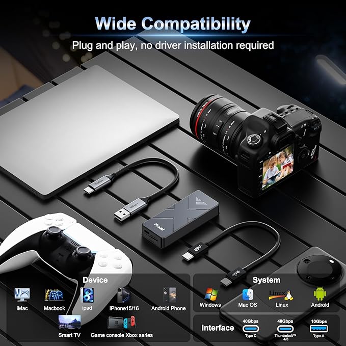 - 【Widely Compatible】FP110 Solid State External Hard Drive requires no software installation; simply plug and play. It supports both Thunderbolt 3/4 (40Gbps) and USB-C (10Gbps) dual modes, making it compatible with devices such as Mac Mini, MacBooks, iPads, iPhone15/16 series models, Android phones, Smart TVs, Xbox game consoles, as well as various operating systems including Windows, macOS, Linux, and Android.