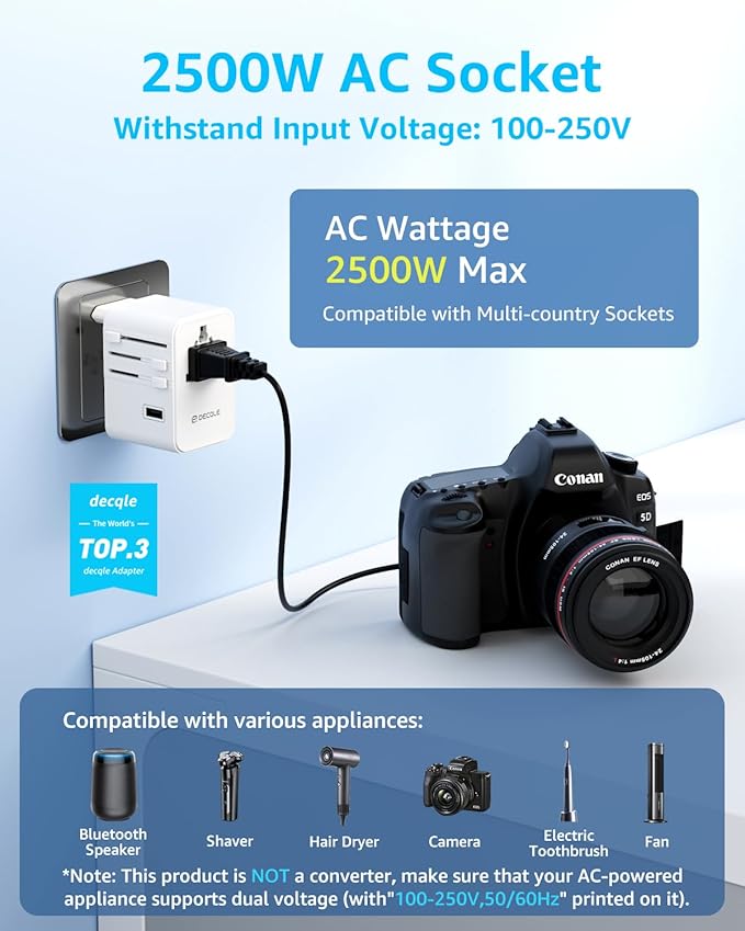 - [AC Socket Power] The adapter has 2500W max AC power and input voltage: 100-250V, it's compatible with various high power devices. This adapter dose NOT have convert function, please make sure that your appliance supports dual voltage (with"100-250V,50/60Hz" printed on it).