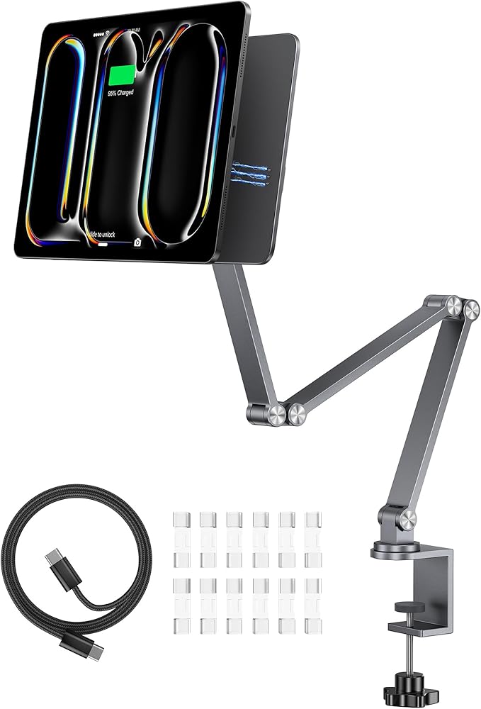 - [Powerful Charging Magnetic iPad Stand] Upgraded ipad arm mount with powerful magnetism and providing up to 18W fast charging for efficient power delivery. This magnetic iPad stand for desk supports wireless charging via three Pin Smart Connectors integrated into the stand. And equipped with a USB-C charging cable, connect it to the stand and place your device on it to start charging
