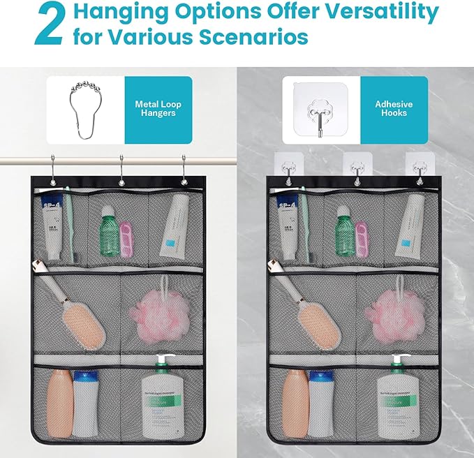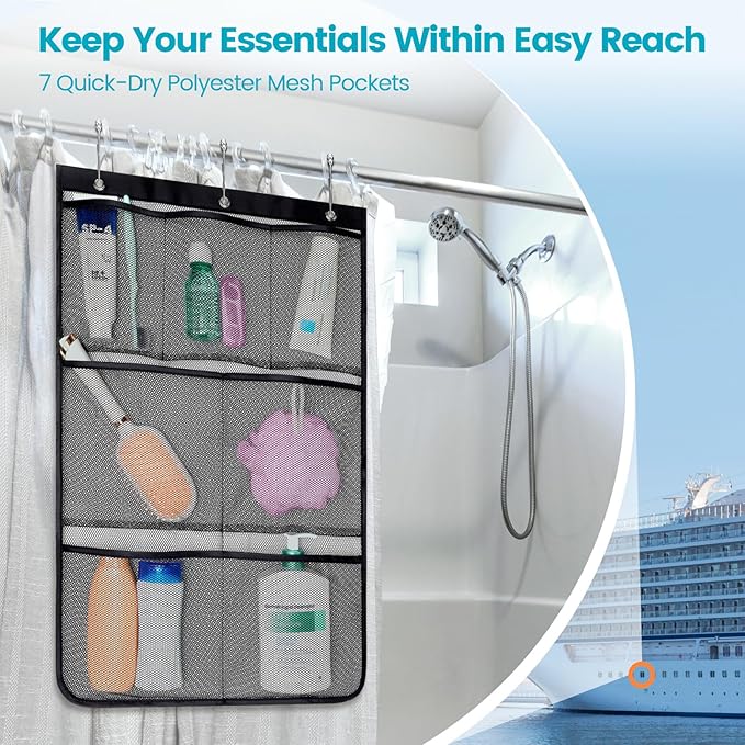 - Keep Your Essentials Within Easy Reach: Effortlessly organize and access your toiletries with hanging shower mesh bag during cruise ships or travel. The 7-pocket hanging design ensures that all your essentials are right at your fingertips. Quick-drying and easy to clean, this travel bag keeps your toiletries neat and dry, even in humid environments. Two versatile hanging options for you to set it up quickly