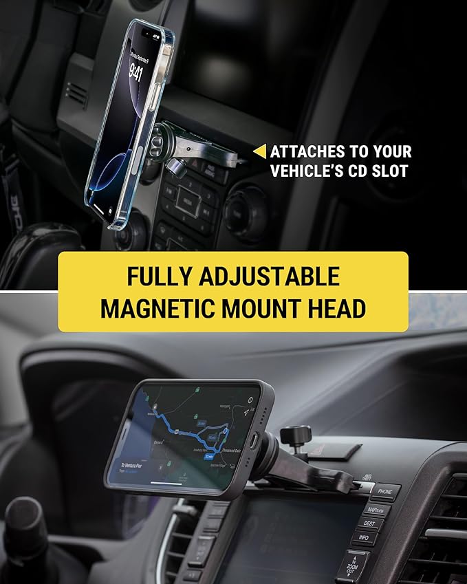 - MagSafe Phone Holder for Car: Experience the ease of MagSafe; simply hover your iPhone 12 or newer over the cd player phone mount and feel it snap securely—maintain a clutter-free dashboard and keep your focus on the road