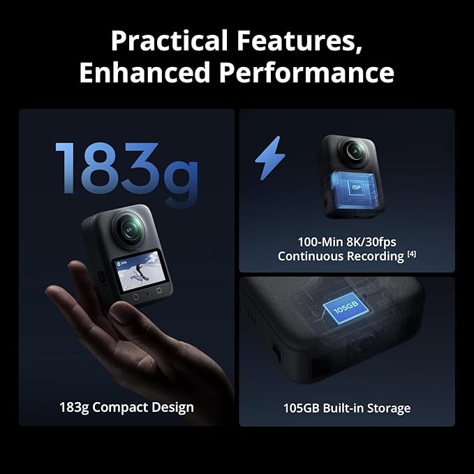 - Stunning, Day or Night - Capture every detail with 8K 360° videos and store them effortlessly with 105GB Built-in Storage. Whether you're exploring city nights or chasing sunrise, your 360 camera delivers crisp, vibrant panoramas, even in low light.