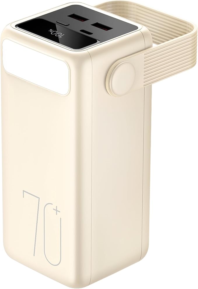 - Ultra High Capacity 70000mAh Power Bank -- The portable charger 70000mAh has a huge 259Wh capacity, measures 5.79 x 3.35 x 3.03 in, and weighs 35.1 OZ (about 2.19lb). It can charge a smartphone about 10 to 21 times and provides power for over weeks, ensuring you stay connected during camping, travels, or unexpected power outages caused by hurricanes. (Note: 70000mAh power banks are not allowed on airplanes)