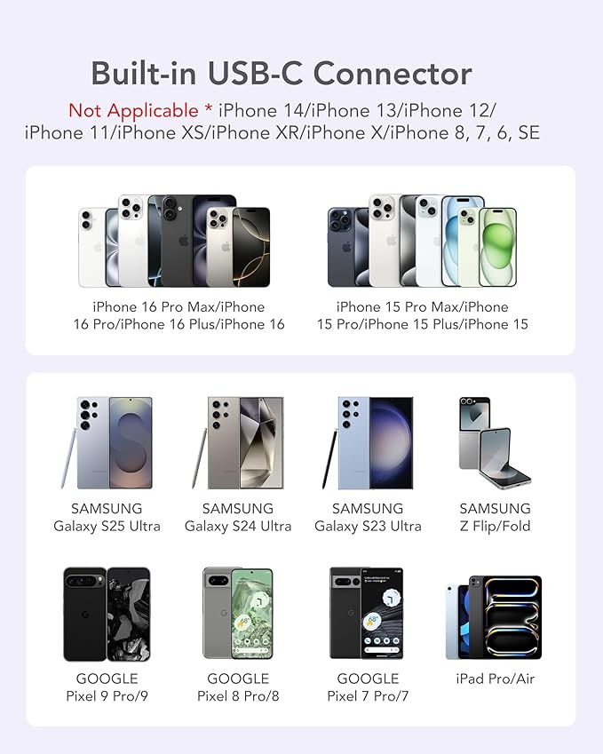 - Built-in USB-C Connector: No cables needed! Just plug directly into your phone and start charging anywhere, anytime. Perfect for people on the move who value simplicity and convenience