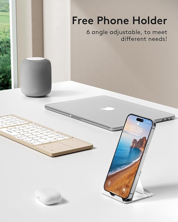 - 【Folding Bluetooth Keyboard & Phone Stand Holder】Extremely thin design of the portable folding keyboard allows you to fold it up and put it in your pocket or bag without taking up too much space. The Phone stand holder, best companion for folding keyboard, gives you perfect screen angle. Near-standard size design provides accurate, fast typing, just like the desktop keyboard you are used to. Quiet keys allow you to focus on your work. Perfect gift for travel and business trips!