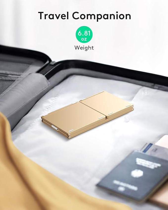 - 【Exquisite & Lightweight Portable Keyboard】Golden matte exterior, made of ABS+PC material, lightweight but sturdy, without fear of daily wear and scratches. The elegant matte design, excellent touch and clean look make it a perfect match for your tablet, phone and laptop. Only 5.53-ounce, palm-sized keyboard can be folded up and carried around. Provide you with maximum convenience with minimal weight and size. It must be a good choice for editors!