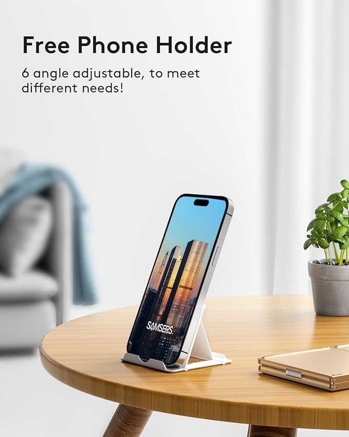 - 【Folding Bluetooth Keyboard & Phone Stand Holder】Extremely thin design of the portable folding keyboard allows you to fold it up and put it in your pocket or bag without taking up too much space. The Phone stand holder, best companion for folding keyboard, gives you perfect screen angle. Near-standard size design provides accurate, fast typing, just like the desktop keyboard you are used to. Quiet keys also allow you to focus on your work. Perfect gift for travel and business trips!