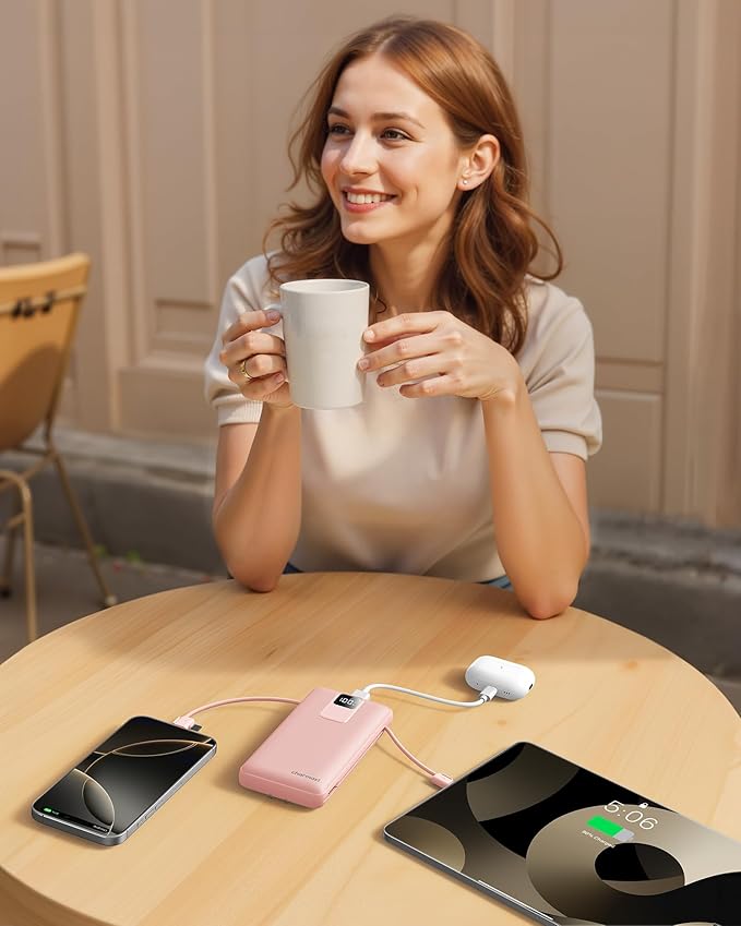 - Built-In Cables & Wall Plug for Hassle-Free Charging: One portable charger power bank meets both charging and discharging needs —no cords or bulky adapters required. Say goodbye to tangled wires and lighten your load. The simpler, sleeter way to stay powered on the go. Perfect for flights, business trips, and daily commutes
