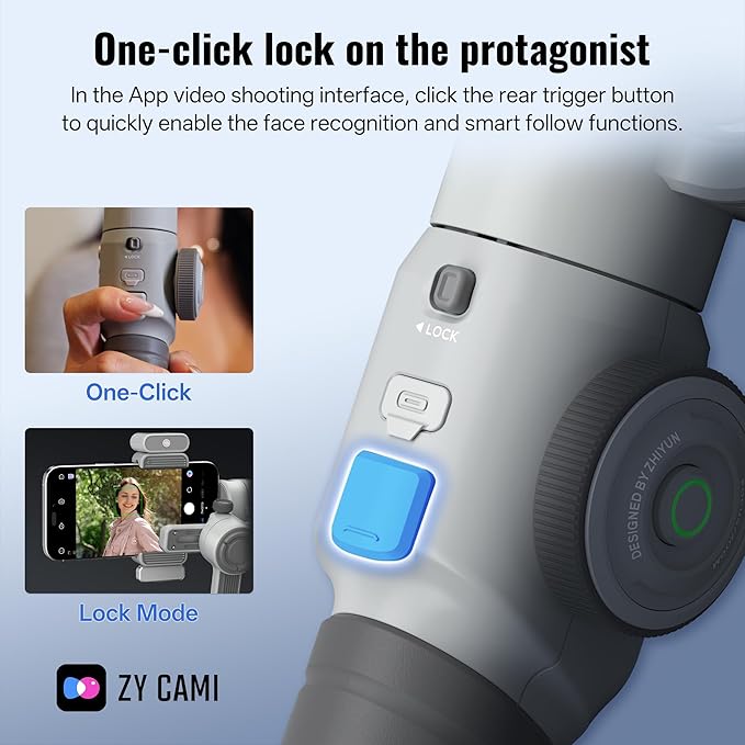 - [Everything Follows, Precise Tracking] In the ZY Cami App's video shooting interface, simply frame your pet, figurine, dancer, or large crowd with one finger to achieve locked tracking. Within the app, you can quickly activate face recognition and smart tracking by pressing the rear trigger button on the SMOOTH 5E phone gimbal stabilizer, allowing you to lock onto the main subject with just one click.