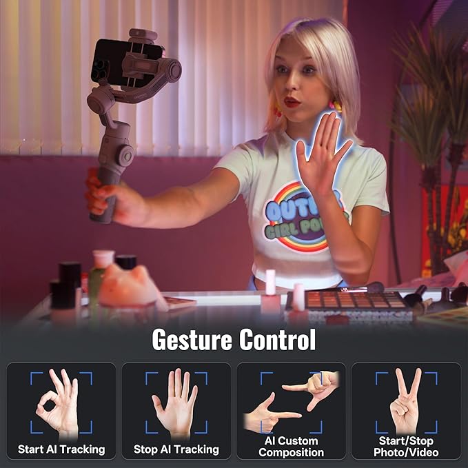 - [Gesture Recognition Control] ZY Cami App has built-in gesture recognition function. You only need to make a "yeah" gesture to start recording, and stretch out your palm to complete the shooting. You can shoot wherever you go and easily lock the protagonist of the video. The CINEPEER SMOOTH 5E is a professional 3-axis smartphone stabilizer ideal for vloggers, live-streamers, vacationers and filmmakers who want to create smooth and steady content. (Gesture control: follow + shoot, only shoot, only follow)