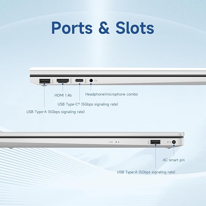 - [Tech Specs] 1 x USB Type-C 10Gbps signaling rate (USB Power Delivery, DisplayPort 1.4, HP Sleep and Charge), 2 x USB Type-A 5Gbps signaling rate, 1 x AC smart pin, 1 x HDMI 1.4b, 1 x headphone/microphone combo, Non-RGB Backlit Keyboard, Fingerprint Reader, Webcam, Wi-Fi 6 & Bluetooth