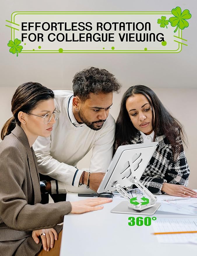 - 360° Rotating iPad Stand:This iPad stand features a 360° rotating base, letting you easily switch between landscape and portrait modes. Perfect for video calls, meetings, and online learning, it enhances your desk setup with flexibility and convenience
