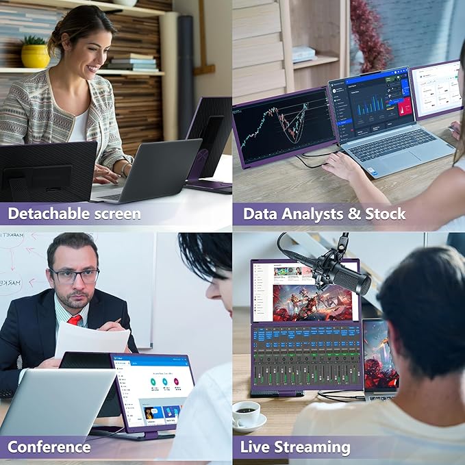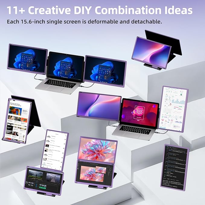 - Detachable & More DIY Display : The 2 screens of the laptop monitor extender are detachable from the bracket. Each screen can be used as a portable monitor with the provided stand. The detachable and rotatable design allow you up to 11 styles of display combinations. More display style gives you more options to optimize your work efficiency, share your ideas and enjoy your entertainment. A must have laptop extender for remote and travel workers, IT and programmers, gamer, stocker traders