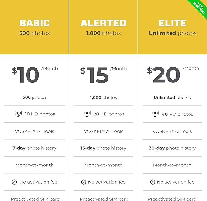 - SIM CARD INCLUDED - Just set it up and let it get to work. No need to purchase a SIM card from a third-party service provider, all VOSKER cameras come with a preactivated SIM card for an easy activation. Monthly plan starts at $10/mo. for 500 alerts, $15/mo. for 1000 alerts or $20/mo. for unlimited alerts. Save 10% with annual billing. Free 7-day trial at activation.