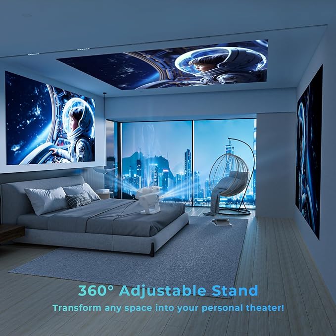 - [360°Adjustable & Detachable Stand: Break Free from Angle Limits]: The Lisowod L02 projector with wifi and bluetooth features 360° rotating, detachable stand (Regular mini projectors on the market only adjust from 0° to 270°), allowing you to project from any angle—whether on the wall, table, ceiling, or anywhere you want. Enjoy clear, sharp images without the hassle of complicated setup or the spend for an extra stand! The detachable stand design makes the Lisowod L02 mini projector with wifi and bluetooth easy to move and store, So you can even use it as an outdoor projector for camping. The L02 mini projector is the perfect portable home theater for you and your family or friends