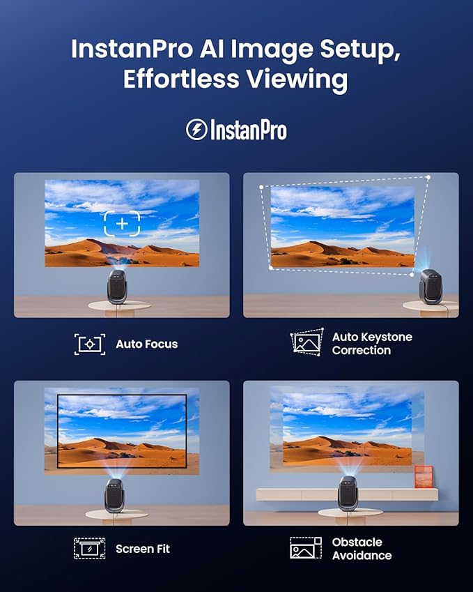 - AI Image Setup, Effortless Viewing: The N2 mini small projector makes setup effortless with InstanPro AI image setup, automatically adjusting to deliver the perfect picture. Enjoy hassle-free viewing with Auto Focus, Auto Keystone Correction, Screen Fit, and Obstacle Avoidance—ensuring a flawless image every time. Whether projecting on walls, ceilings, or floors, the N2 mini ensures a smooth, precise viewing experience without the need for manual adjustments.