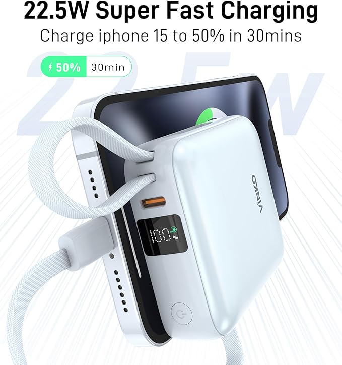 VINKO Portable Charger with Built-in Cable, 10000mAh 22.5W Fast Charging USB C Battery Bank, Cell Phone Power Bank for iPhone 16 15 14 Samsung Galaxy S24 S23 Series Android Tablet (Blue)